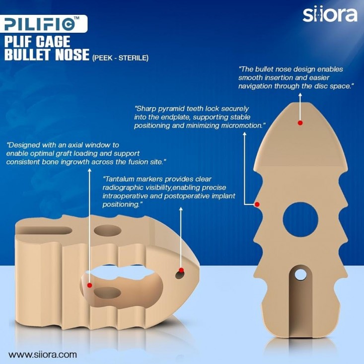 "PILIFIC PLIF Cage Bullet Nose by Siora Surgicals Pvt. Ltd. is an advanced spine implant designed for the restoration of disc height and to promote vertebral fusion. Made from biocompatible PEEK, this spine implant finds application for posterior lumbar interbody fusion. It has a tapered side profile that ensures secure locking into the plate whi..."